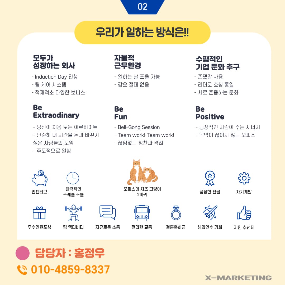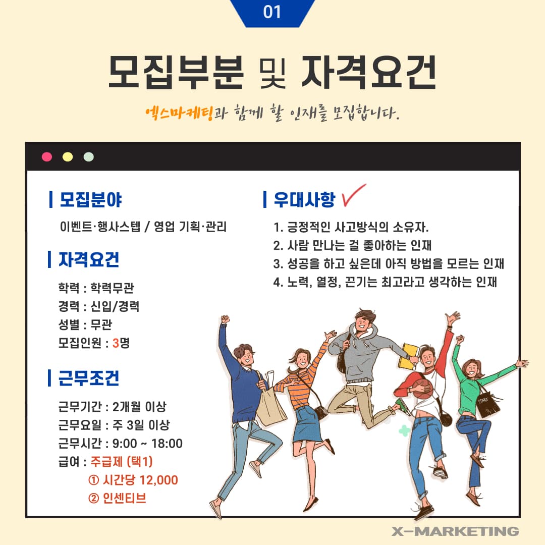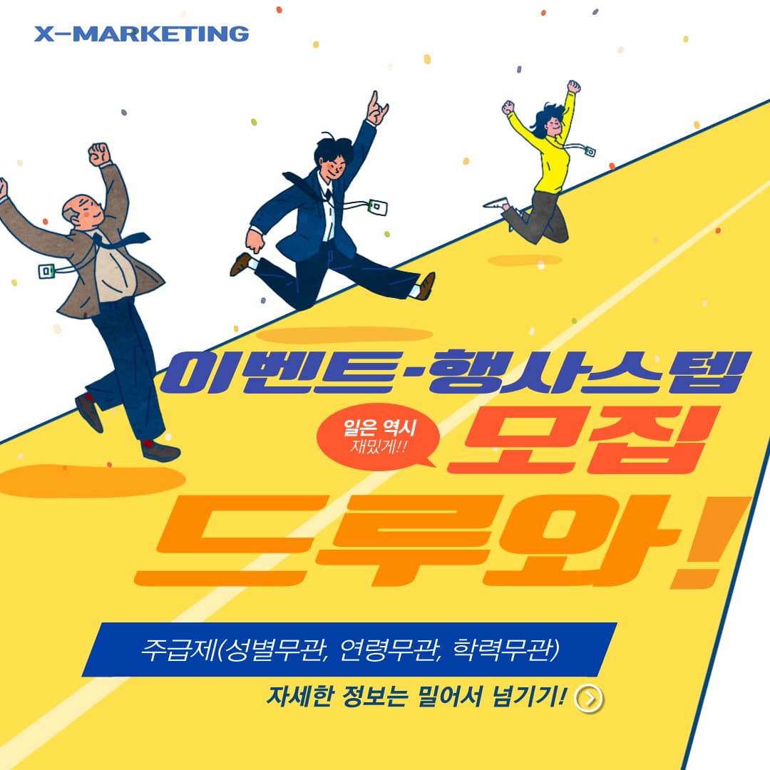 1호선,2호선 신도림역 도보5분 앞에 위치한 X-MARKETING (주)엑스마케팅 🗯이벤트, 홍보마케팅, 팀매니징, 행사 부스🗯 ✅지원자격 성별 : 성별무관 연령 : 20대 ~ 30대 학력 : 학력무관 우대조건 : 유사업무 경험, 인근거주, 외국어 가능자, 긍정적 마인드 소유자, 장기근무자 ✅근무조건 주 3일이상 2개월이상 장기 근무 우대 ✅급여 시급 : 12,000원, 성과제(주급) ✅모집부분 서비스 - 담당업무: CS교육 및 행사장 관리 - 자격요건: 리더쉽, 매니지먼트, 관리/운영 행사스탭 - 담당업무: 행사 진행 - 자격요건: 활발, 정직, 긍정적인 마인드, 성실 ✅지원방법 : 채팅 or 문자 or 이메일 -문자 지원시 ****지금우리 보고 연락 드렸습니다***라고 남겨주시고 성함, 나이, 성별 남겨주세요