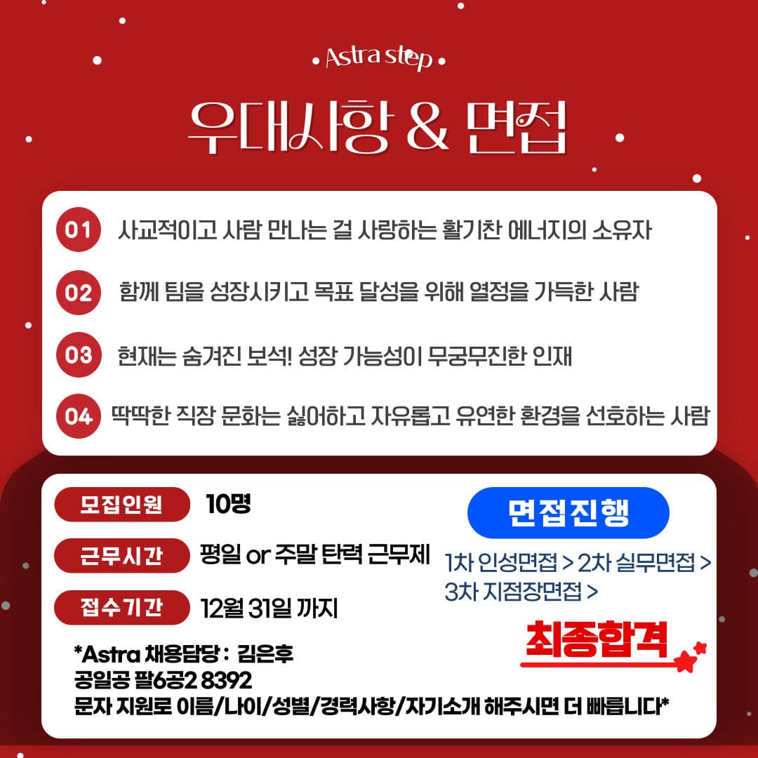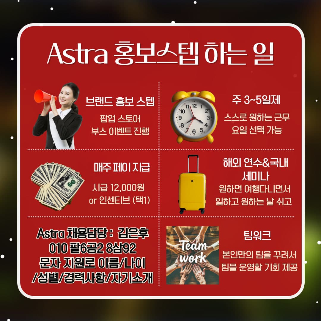 안녕하세요 새해의 MZ들을 위한 꿀알바 모집합니다 😆 업무내용 : 행사 스탭 업무 / 이벤트 행사 기획 및 관리 시급 12,000원 or 성과제 (선택가능) > 주급제 !!!🔥 주 4~5일 주마다 원하는날 선택해서 근무가능(월~일중 선택해서 가능) 탄력근무제로 출퇴근 시간 조율 ok 우대사항 : 활발하고 적극적인 E성향 대환영(I도 환영해요) 채용담당자 김은후 번호로 성함/나이/번호/경력사항/간단한 자기소개 해주시면 더 빠릅니다