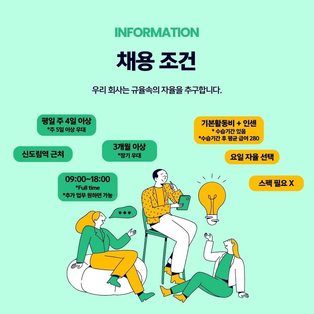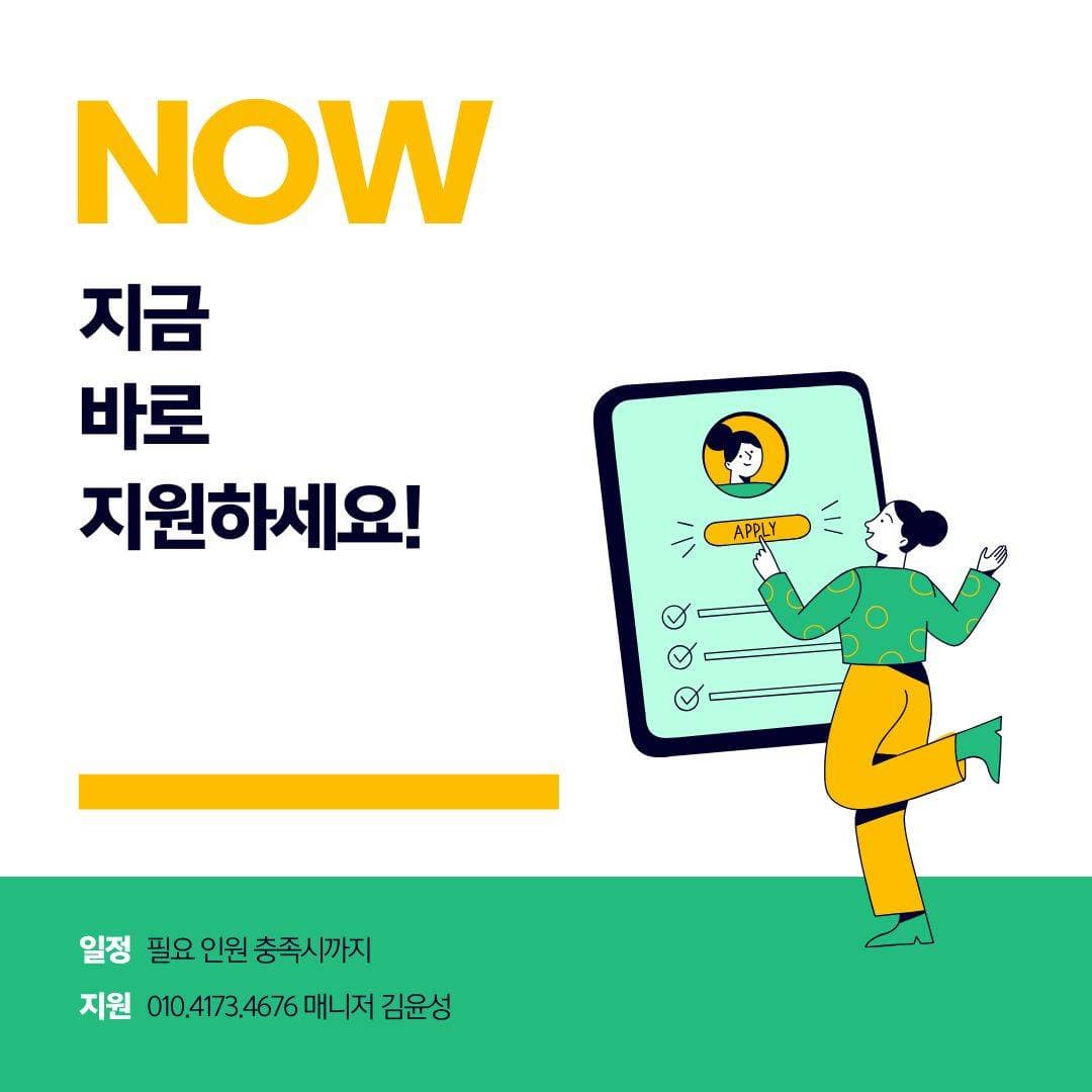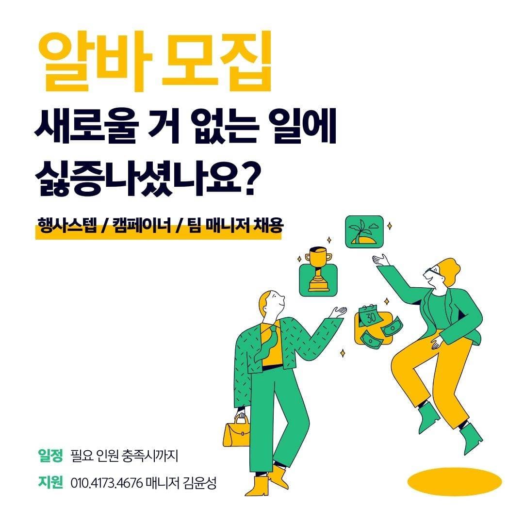 행사스텝 꿀알바 모집!! 월~일 09:00 ~ 18:00 협의 《DST-MARKETING》 공익 활동 관련 기관과 협력 중인 대행사에서 시민 대상 거리 홍보 활동을 보조할 인력을 모집합니다. 🐱사람 좋아하는 댕댕이 같은 분!🐱 ‼️ 유동적인 스케줄의 알바가 필요한 분! (취준생/휴학생/예체능계열 직업 추천!!) ‼️커뮤니케이션 능력을 키우고싶은 분! ‼️따뜻한 사람들이 있는 회사에 다니고 싶은 분! ‼️의미 있는, 배울 수 있는 알바를 하고싶으신 분! 👐여기예용👐 [주요 업무] - 거리 홍보 부스 현장 세팅 및 정리 - 시민 대상 공익 활동 관련 정보 안내 - 간단한 참여 정보 입력 및 기록 보조 [활동 조건] -월급:추후협의(수습기간 있음) - 활동 시간: 9:00~18:00 (점심시간 1시간 & 시간당 휴게시간 포함) - 활동 요일: 주 3일~7일 매주 유동적으로 가능! - 활동 장소: 서울 & 서울 근교 번화가, 역사 인근 [지원 방법] -지원자 한마디에 [성함/나이/남.여/전화번호/ 전화가능시간] 남겨주시면 전화드릴게요 *본 활동은 공익 활동을 수행하는 기관과 협력 중인 공식 대행사를 통해 진행됩니다 #인센티브지급 #친구와 함께 가능