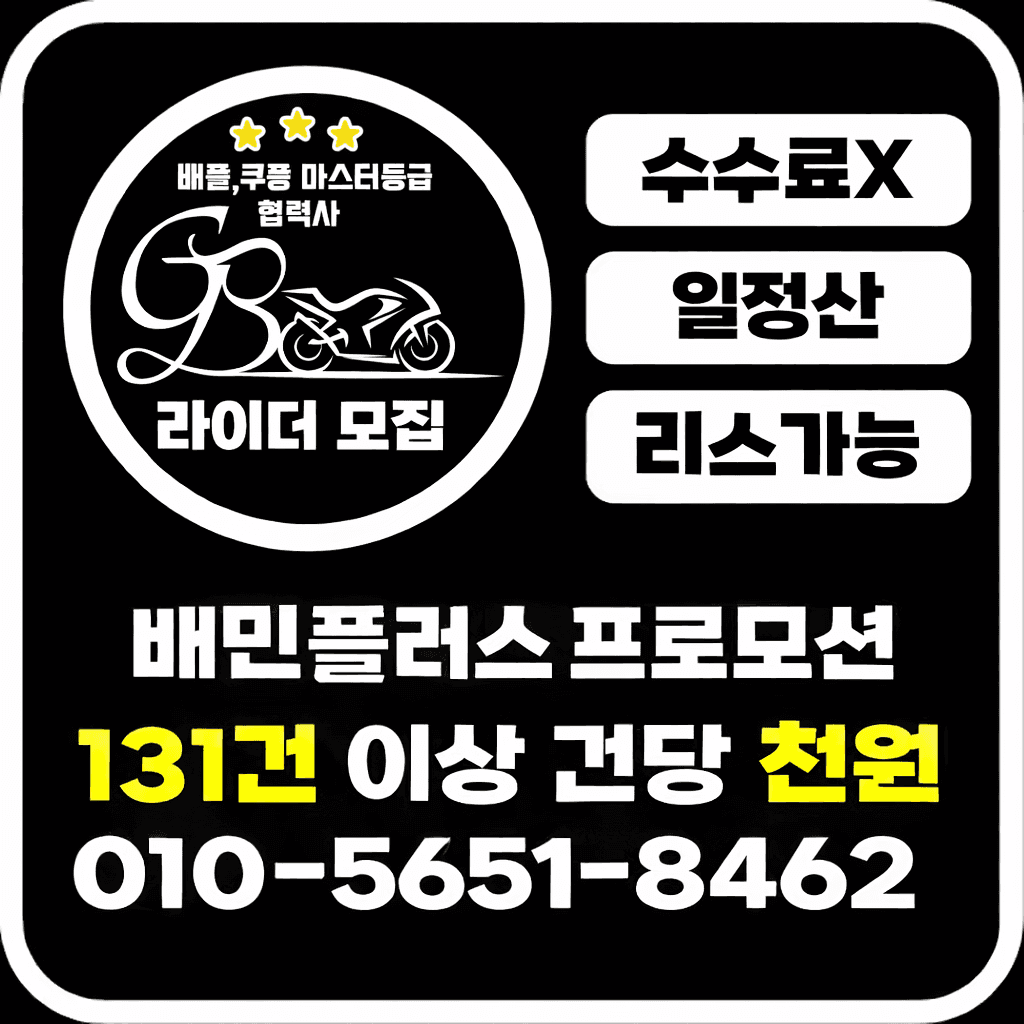 부평 배민플러스 신입기사모집합니다!! 일주일총배달131건수이상건당1000원 프로모션지급! 연락주세요!!!